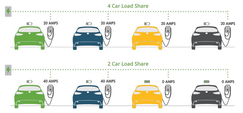 When only one car is plugged into those four chargers, it receives the full amount of power (load). However, when a neighbour pulls up and plugs into the charger beside it, the EV chargers split the energy between the two chargers. This is called load sharing. If all the EV chargers were operating at full capacity simultaneously, they would place a huge demand on the electrical system and potentially overload it. Therefore, load sharing helps ease the stress on the electrical system.